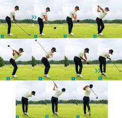 そのコツとしては、体の動きを先行させすぎないこと。ハーフウェイダウンからフォロー(写真5〜7)にかけては体が正面に向けたままアームローテーションすることで、インパクトが安定します。特にスライスに悩んでいるアマチュアは体が先行しすぎて、腕が遅れてしまった結果、フェースが開いてしまうので注意しましょう。
