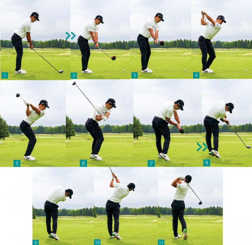 飛距離と方向性を両立できるポイントは、ダウンスイングからフォローにかけての左腕の使い方にあります。中島選手のスイングを見ると切り返しでは左ワキが締まっていますが、ハーフウェイダウン(写真5)からインパクト(写真6)にかけて左腕が胸から離れて、フォロー(写真7)になると左腕が目標方向にしっかり伸びています。