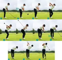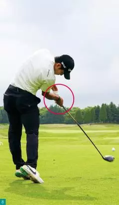 ただし、アマチュアはインパクトで手元を高くしようとすると、上半身が伸び上がってしまい前傾角度が崩れやすい。手元は高くなっても、中島選手のインパクトのように前傾角度をキープしておくことが大切です。(写真8)