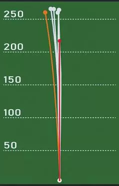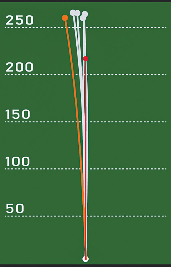 高橋プロが標準シャフトで試打を行った5球の弾道。安定した弱ドローで飛距離も全打250ヤード超。
