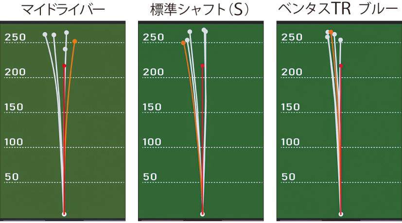 「標準シャフトでもカスタムシャフトでも十分つかまり過ぎないと感じましたが、カスタムシャフトにしたらさらに球のつかまり過ぎが減って、自分ではヒッカケたと思ったショットでもイメージの半分くらいの曲がりで済みました」と納得。弾道図で打球のばらつきの少なさが一目瞭然。