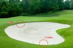 高いところから入ると砂が崩れるので、多少ボールから離れていても、必ず低いところから入るようにしましょう。そして入口を見つけたらそこが出口にもなるので、その付近にレーキを置いてバンカーに入ります。