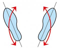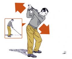 左右の母趾球とカカトに対称的に体重移動することで、身体の中心を軸にスムーズに回転しやすくなる。ただし、クラブの動きの慣性に引っ張られて、動きすぎてしまうことも。