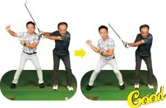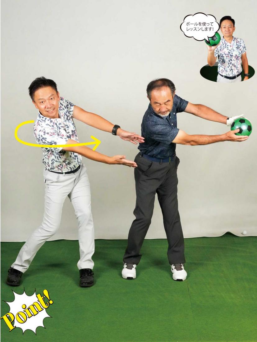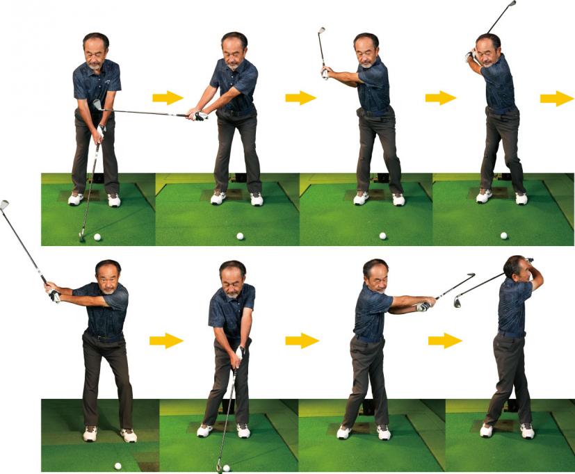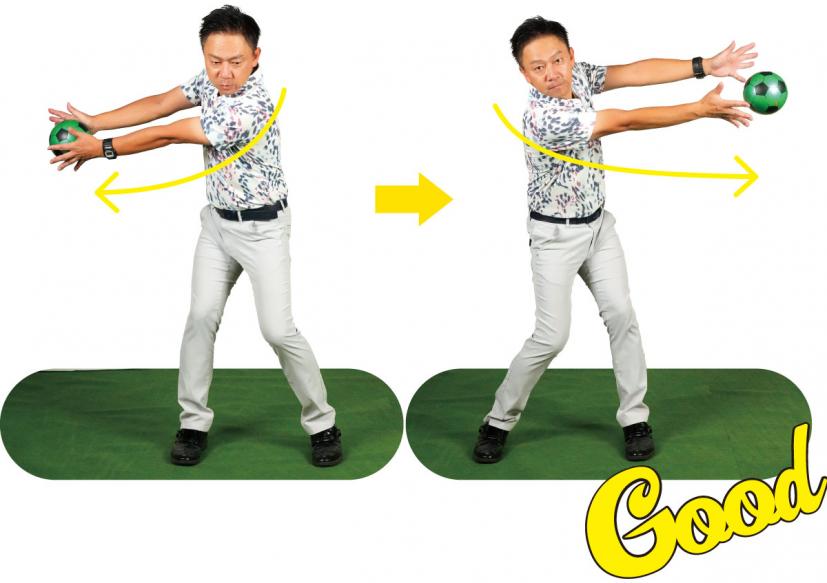 (写真右)フォローでも腕ではなく上体の回転で前方へ!