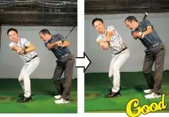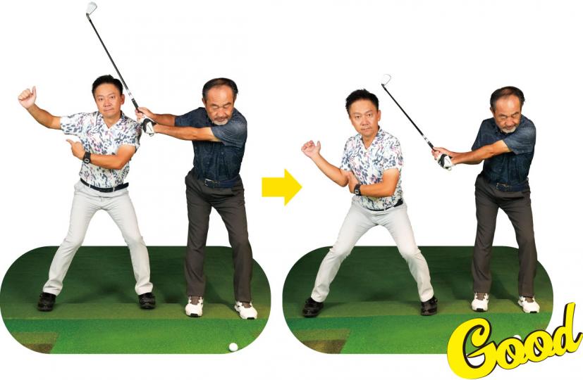 (写真左)右手が強いとフォローで左ヒジが引けてしまうが