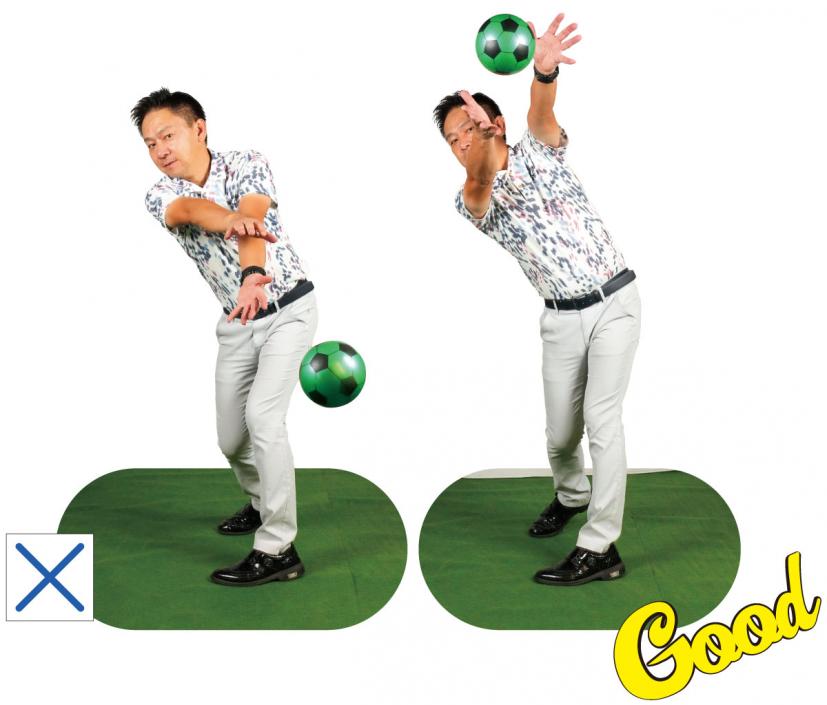 (写真右)右腕を使わず下になればボールを目標へ投げられる!