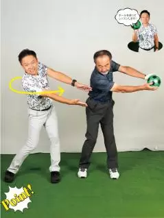 クラブの中ほどを握り、グリップエンドを腹に密着させます。そのまま腕を一切使わずに、体の向きを飛球線後方へ向けてテークバック。また体の向きだけを飛球線方向へ変えてフォロースルー。この動きだけでも球はしっかり飛んでくれることを確認しましょう!
