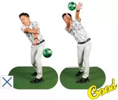 (写真左)右腕をコネて上になるとボールは左下へ!