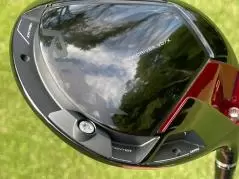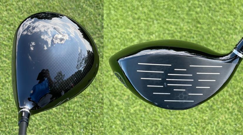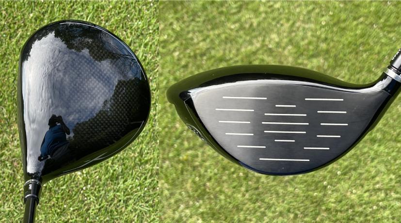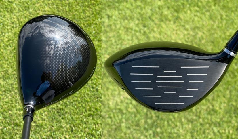 構えてみると、ネック側が少しシェイプされていて洋梨っぽいとてもいい形です。445ccと少し小さめで、個人的には操作性が良さそうで好きです。カーボン素材が少し透けているようなクラウンは少し丸く盛り上がっているような感じです。この盛り上がりのおかげで、フェースセンターの少し上でインパクトしやすくなっているということです。