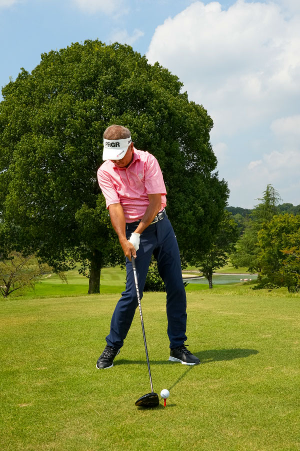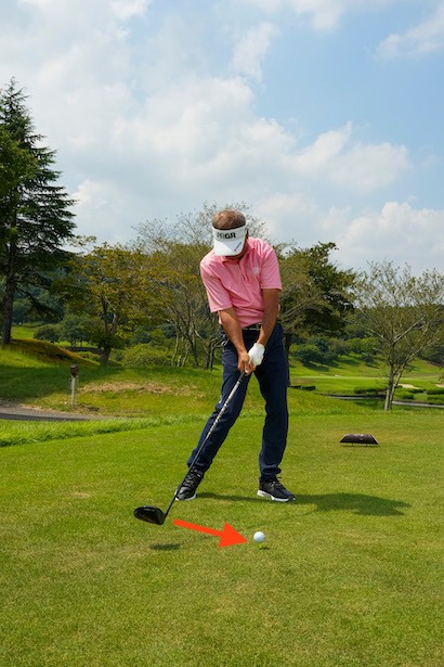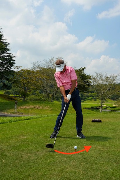 (1)1つはティアップを高くすることです。カット軌道だと上から下に振るスイングになるのですが、ティアップが高い状態でこうなると、ヘッドがボールの下を潜ってテンプラになりやすい。そのためヘッドをレベル、もしくはやや下から入れるイメージをもつことが必要になります。