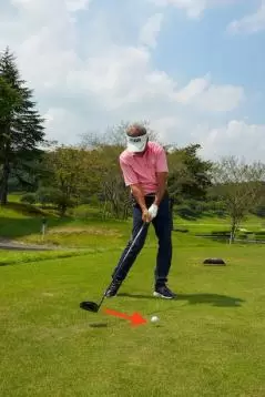 (2)もう1つはハンドレイト気味でインパクトすることです。グリップエンドが体の中心より右にある状態でインパクトするイメージをもちましょう。