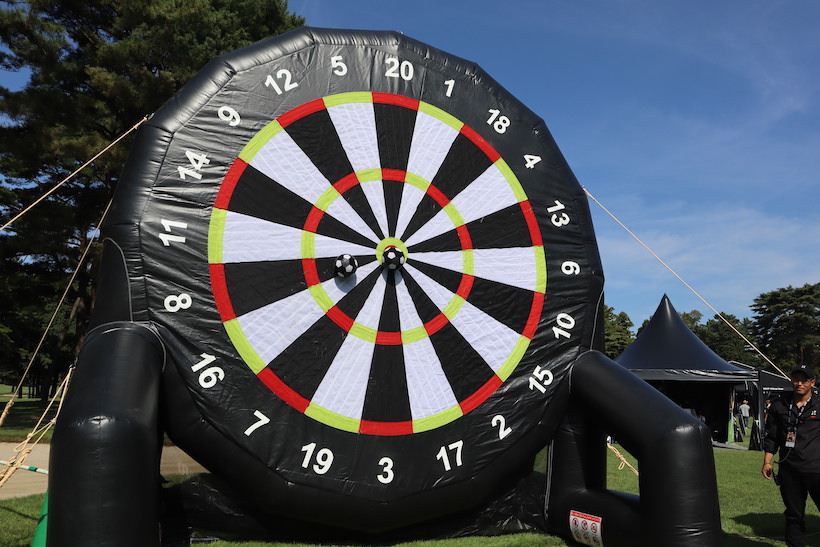 まず、FUNエリアにドーンと待ち構えていたのは、ジャンボダーツ。大きなダーツの的に向かって、サッカーボールをドカーン。これ、子供だけじゃなく、意外と大人も楽しい。しかも見た目以上に難しい…意外とボールが重たくて、全くボールが上がらずコロコロさせてしまったり、気合いを入れすぎてOBしたり。子供たちよりも、付き添いのご両親が熱中している様子もちらほら。