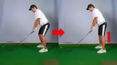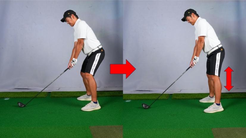 まず上下動の予防ですが、アドレスでヒザを曲げすぎないことがポイントです。曲げるから伸びる、伸びるから曲がるわけで、はじめからあまり曲げないようにし、そのバランスを崩さないよう重心を上げてスイングしましょう。コツは太モモの裏に張りをもたせて構えることです。