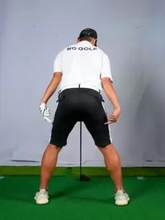 軸を安定させるには、打つ前に大きく足を開いて大股で立ち、なおかつ両ヒザを内側に寄せた内股スタイルで素振りをします。こうすると股関節が適度に閉まってヒザが動きづらくなるため軸が安定します。