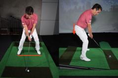 (2)もう1つはボールとの距離が遠くなること。構えた時にボールがクラブヘッドより低い位置にくるので遠くなる。この状態でバランスを崩さないように振ると、前のめりにならないようにしますから、クラブヘッドとボールはより遠ざかりやすくなります。
