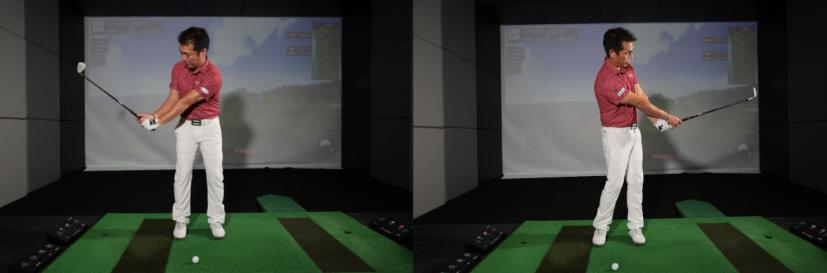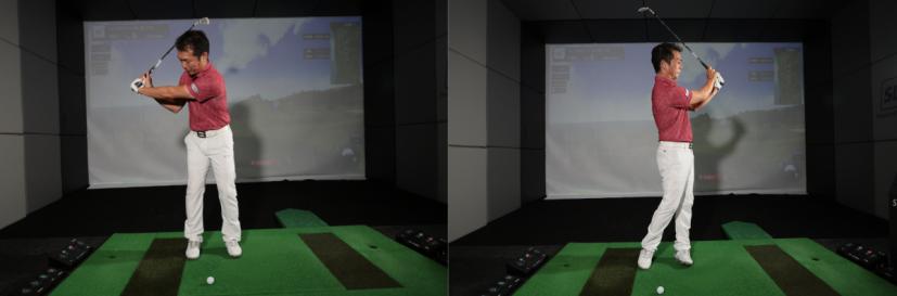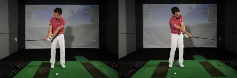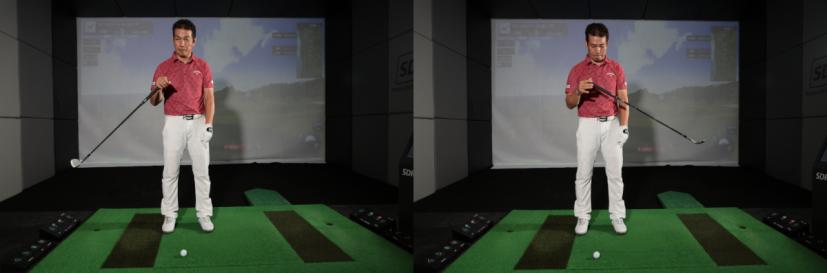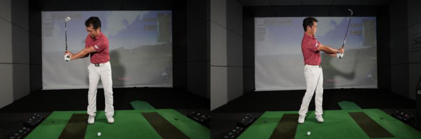 クラブはロフト58度のサンドウェッジです。第1段階は正面から見た時にクラブが45度上がる振り幅。