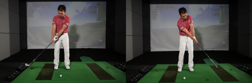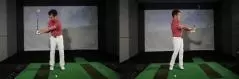 第2段階は90度の振り幅。正面から見るとトップとフィニッシュでそれぞれシャフトが地面と平行になる振り幅で、僕がこの振り幅で打つとキャリー10ヤード。第1段階の2倍になります。