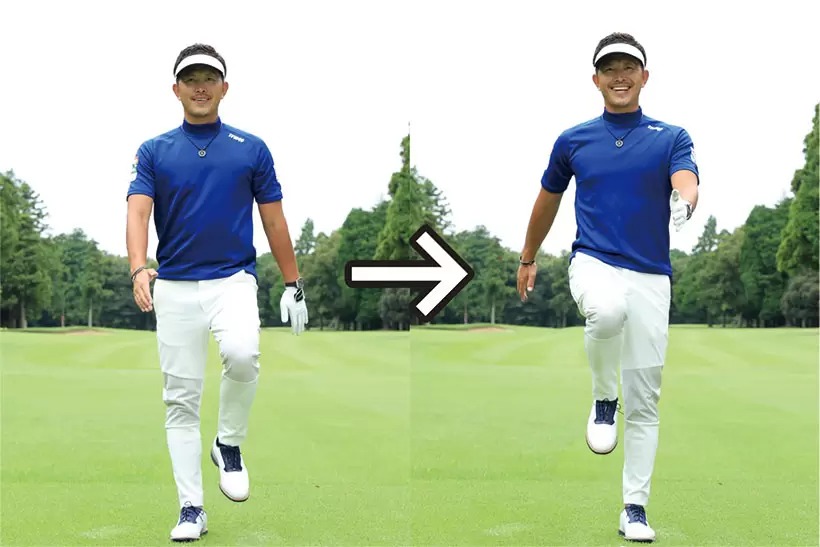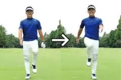 ボクはゴルフのスイングというのは「足踏み感覚」と考えています。歩くときは両手を前後に振り、両足はツマ先とカカトの間の体重移動が自然に生まれますよね。左足を前に出せば右腕を前に、右足が前なら左腕が前に振るという感じでカラダの対角線で動くでしょう。「体重移動」という言葉は決して間違いではないけれど、その正体は「前後の重心移動」なのです。