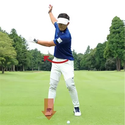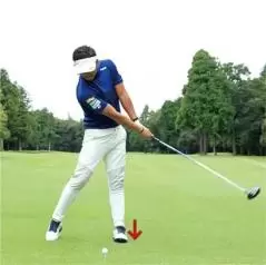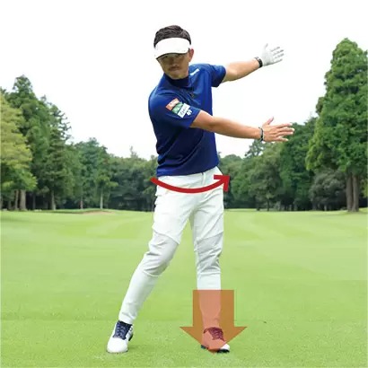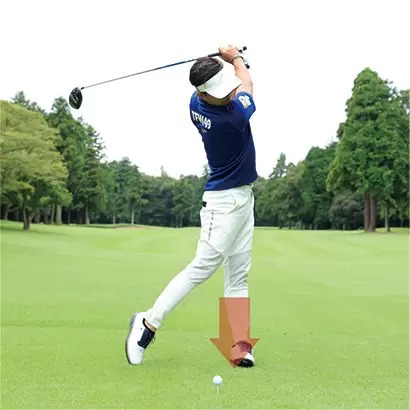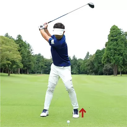 ダウンスイング以降で右カカトを浮かせるのはカラダの回転スピードを上げるとか、フィニッシュまでしっかり振り切るための絶対条件ですが、バックスイングや切り返しでの左足の重心移動もナチュラルに行なうことにも気を配りましょう。