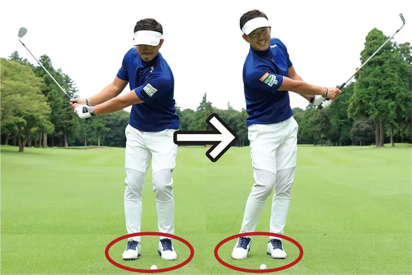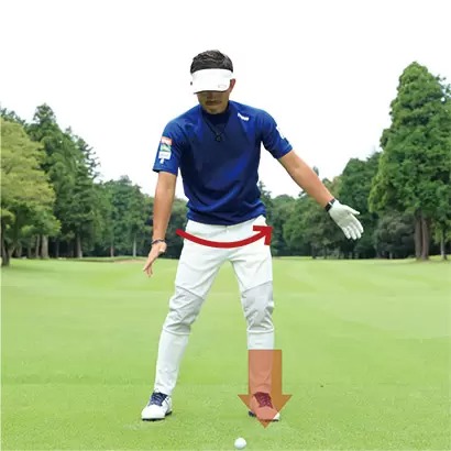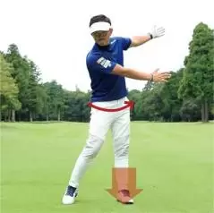 慣れてきたらバックスイング時の左足のヒールアップを小さくしてもいいですし、左カカトを浮かせないでベタ足のままでも構いません。ただし左足の裏で前後の重心移動、すなわち「足裏の圧力の前後移動」を感じておくことが大事です。