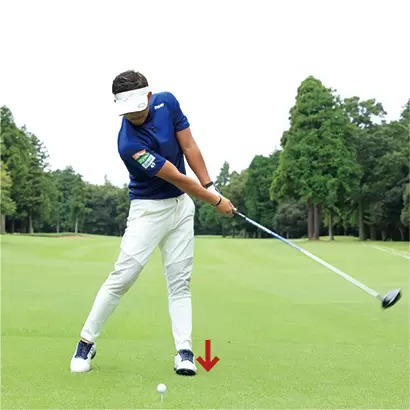 「バックスイングで右足、ダウンスイング以降は左足」と考えれば、体重移動は「横移動」の感覚となりますよね。ところがそのような意識を持つとバックスイングで上体が右に大きく動き、その反動でダウンスイング以降は上体が左に流れやすい。カラダの回転軸が左右にブレてミート率が低下してしまい、カラダを大きく使った割には飛距離があまり出ないのです。