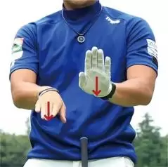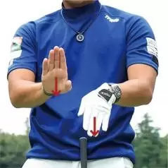 歩くときは両腕を前後に振りますが、今度はクラブを持たないで足踏みしながら両腕を左右に大きく振りましょう。バックスイングでお腹を右に回せば体重が自然に右足に多く乗り、ダウンスイング以降でお腹を左に回すことで体重が勝手に左足に多く乗るわけで、感覚的にいって能動的な動きとは違います。