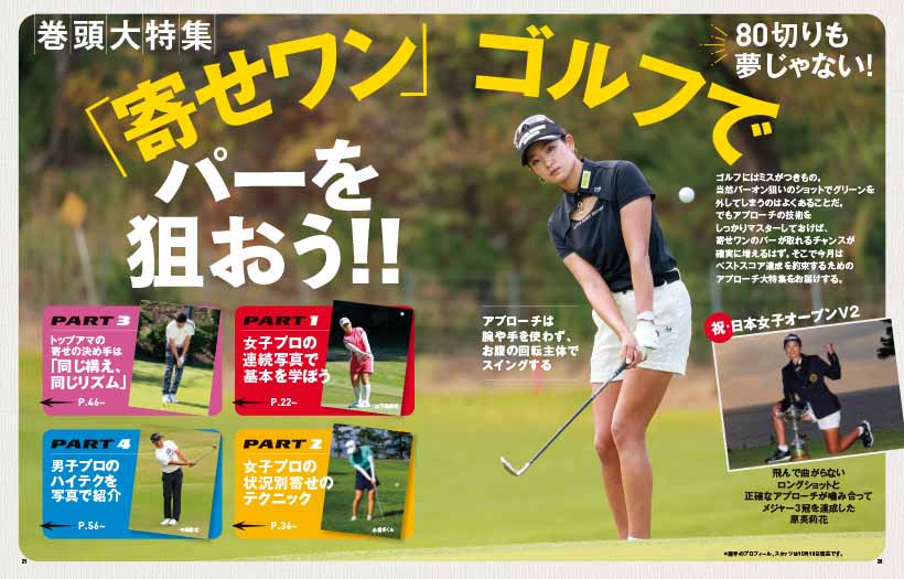 巻頭特集はスコアメイクに直結するアプローチショットをテーマに「寄せワン」ゴルフでパーを狙おう!というゴルファーなら実現したい目標のレッスン。パート1では女子プロの連続写真を多用して、まずは基本亭な打ち方のコツからスタートし、パート2では状況別、パート3はトップアマチュアがどのような決め事をして寄せているかを紹介。パート4は男子プロのハイテクニックをみせるというショートゲームを網羅した30ページを超える大特集。