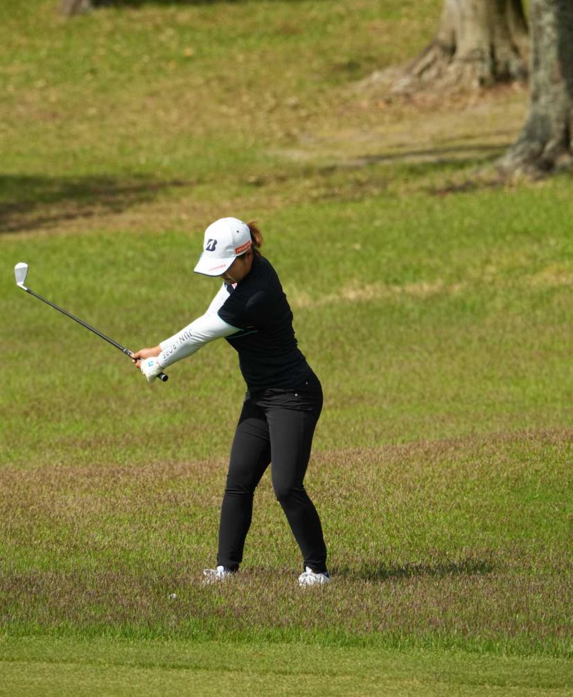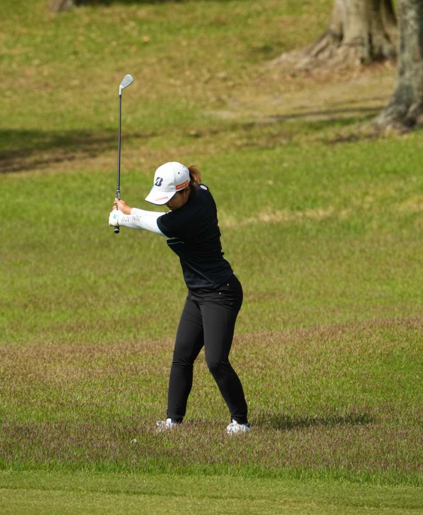 高橋彩華のアイアンスイング(斜め前方)|フォロー①