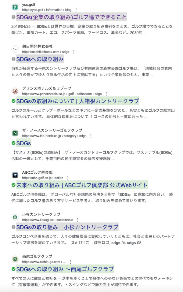 Googleで「SDGs ゴルフ場」と検索した結果。