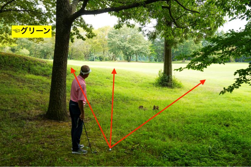 林に打ち込んでしまった場合には脱出するのが最優先ですが、距離を欲張らず真ヨコに出すのが安全なこともあれば、グリーン方向に打つ方が安全なケースもあります。グリーンを狙えることもあるでしょう。