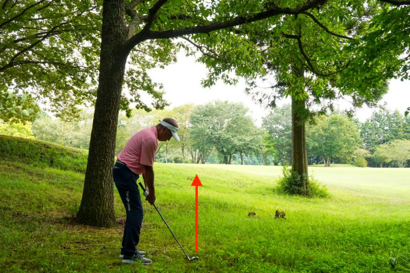 注意してほしいのはアイアンを使う時。アイアンはボールが思った以上に上がります。特にアベレージゴルファーは、すくい打つ傾向のスイングになっている方が多い。自分がイメージしている弾道と実際の弾道にかなりのギャップがあるため、うまく打ててもボールが上がって枝に当たることがよくあるのです。打ち出す方向に枝が張り出しているケースでは、ロフトが少ない番手を選ぶのが賢明です。