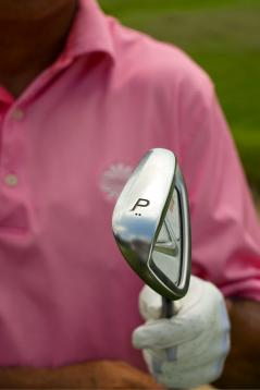 クラブはロフトが少なめのPWや9番アイアンを短く持つ。