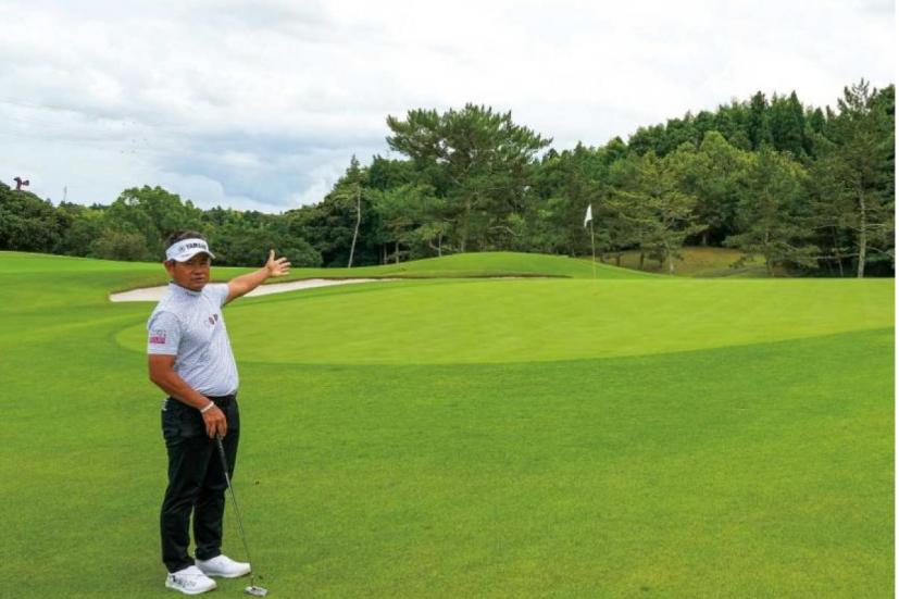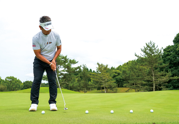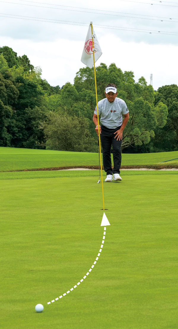 素振りをしながら、カップまでのボールのコロがりを頭の中にしっかり描き、それを再現するようにボールを打つ。本番でもこの作業がとても重要。