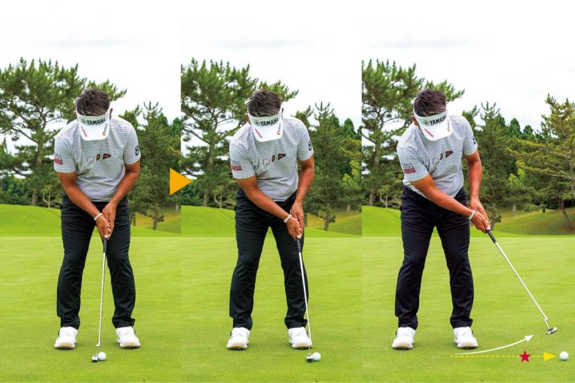そこで、構えたらテークバックを取らずにボールを真っすぐコロがしてみましょう。ボールの30~50センチ先にスパット(目印)を設定し、そこに向けてフェースをスクエアにセット。スパットの上をボールが通過するように押し出すことがポイントです。