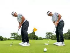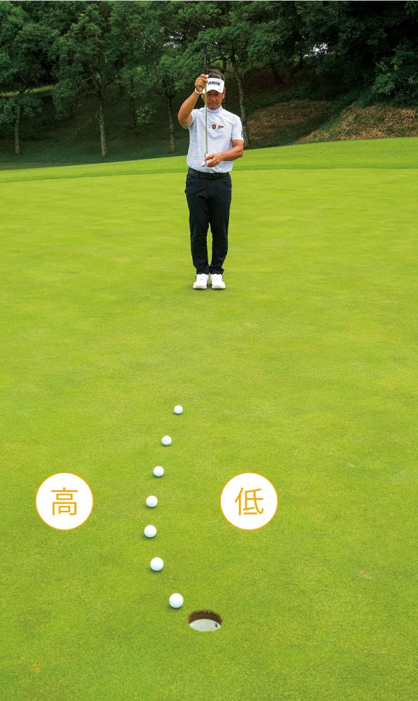ボールは見ずにカップを見たまま打つ。この時のストロークが最も自然で、距離に合った適正な振り幅になる。ボールを見なくても当たる、パットならではの練習法。