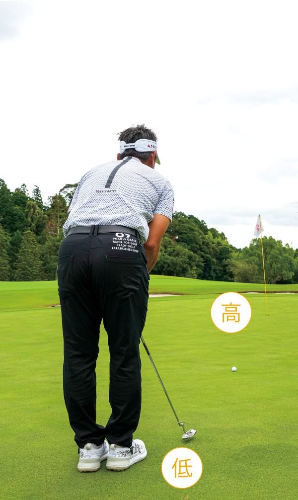 スキーで雪山の急斜面の上に立つと、斜面が見えにくく勾配がわかりづらい。下から見上げたほうが細かい起伏などもよくわかります。それと同様、グリーンが読めない時は全体を見渡して、「傾斜の低い位置に立つ」ことが重要です。