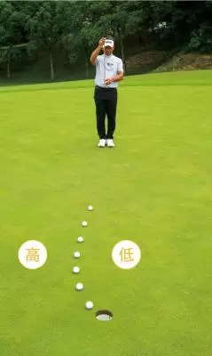 グリーンに上がる前に全体の傾斜を見て、低い位置を事前にチェック。そしてボールとピンのおおまかな傾斜をつかんでおく。