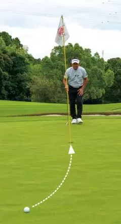 まずは、カップを見たままボールを打ってみましょう。練習グリーンの場合、5~10メートルのストレートラインにボールを置き、素振りをしながらカップまでのコロがりを頭にしっかり描きます。そして、ボールを見ずにそのままストロークします。