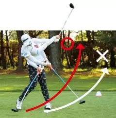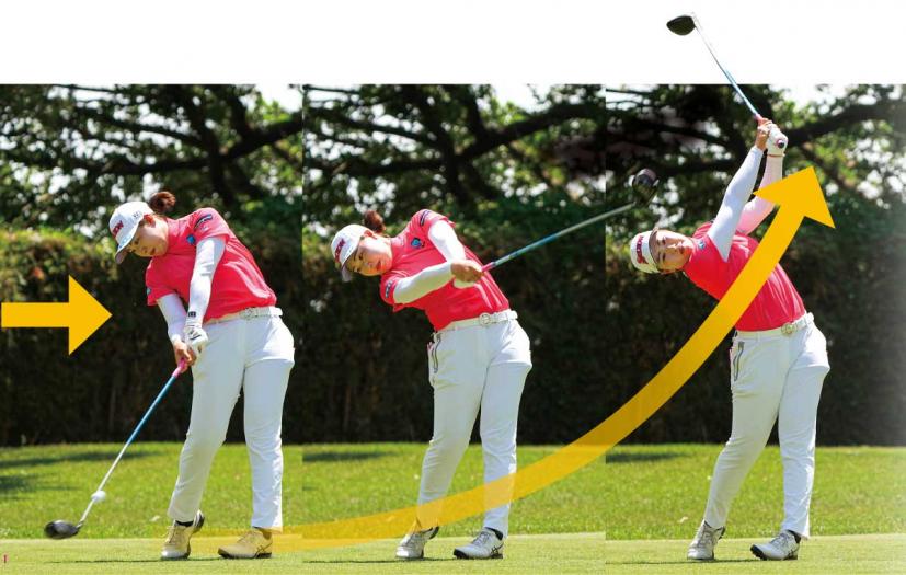 無理にクラブヘッドを目標に向かって出すことはしない。体の回転に伴い、自然な位置にヘッドを振り抜く。その結果、フォローは小さくなるが、ヘッドスピードは増す。