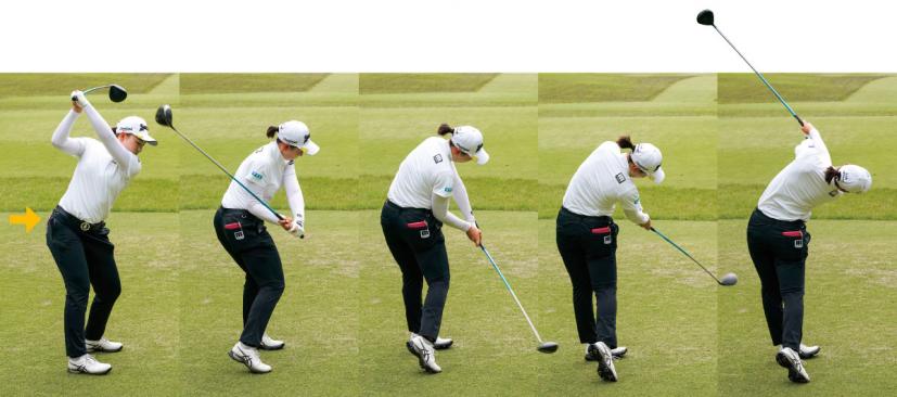 バックスイングで蓄積したパワーをダウンスイングからフォローにかけて一気に放出。体の回転に伴いクラブを下ろす。ダウンスイング以降も腕に力を入れない。