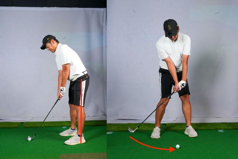 具体的にはボールの浮き加減によってアドレス時のヘッドの位置を変えますが、腕の曲げ伸ばしでアジャストするのではなく、やや立ち気味にアドレスすることで対応しましょう。これに伴い、スイングではノーマルなライに比べてヘッドの入射角が浅くなる。そのイメージをもってスイングすればショートは防げます。