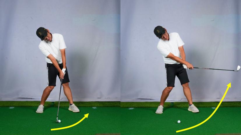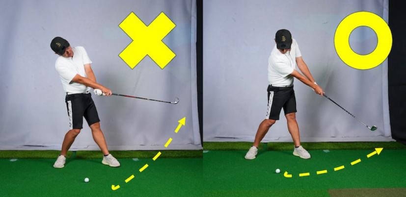 アイアンでフォローがメインのスイングをすると、アッパー軌道になって当たるのでこれを修正する必要があります。