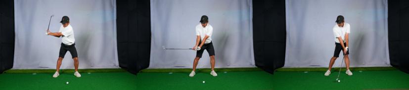 ドライバーもアイアンもスイングは同じで、イメージは振り子運動。時計の振り子のように左右対称に振られる途中でボールをとらえます。このイメージで言うと、ドライバーは振り子の左サイド、アイアンは振り子の右サイドでボールを打つ感じになります。