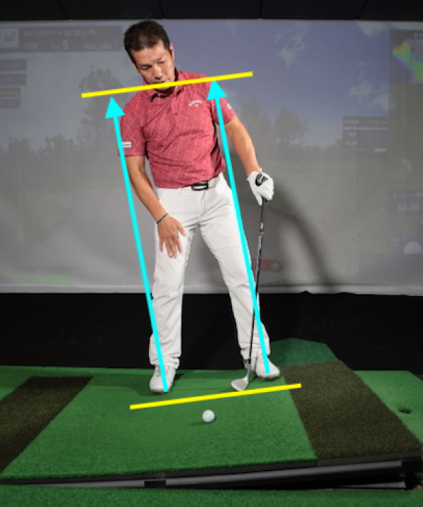 スタンス幅の目安は肩幅。肩のラインを傾斜と平行にします。