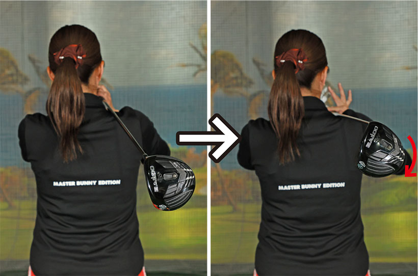 4・両手を元どおりに握り直してクラブを胸の前に戻せば、フェースがかぶっていることがわかる