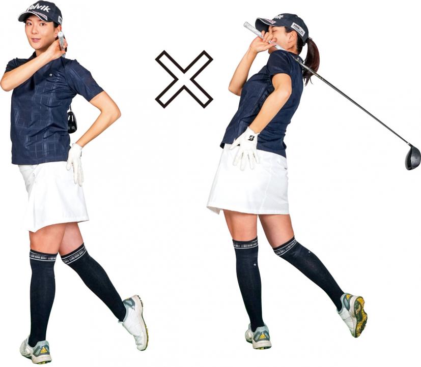 フィニッシュで上半身が目標方向に向いているのはまだ回転不足。上半身はアドレスと真逆の向きまで180度回転しているのが理想です。