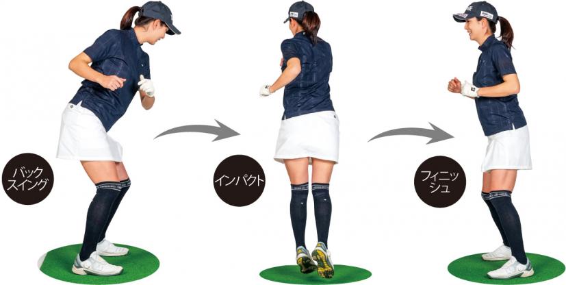 下半身の使い方はジャンプする動きに近い。バックスイングで少し沈みこんで、インパクトからフォローにかけてジャンプすると体を180度回せる。