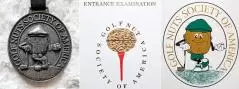 GOLF NUTS SOCIETY OF AMERICAのロゴマーク、会員証、バッグタッグ。1986年アリゾナ州で発足。どれほどゴルフに夢中か「だけ」を競う会。著名会員はマイケル・ジョーダン、クリント・イーストウッド、ヒューイ・ルイス、フィル・ミケルソン、設計家RトレントJr.ら。年ごとに合計ポイントで年間狂者ナッツ・オブ・ザイヤーを選出。会員は申請書に年間ラウンド回数などゴルフに関するすべてが対象。