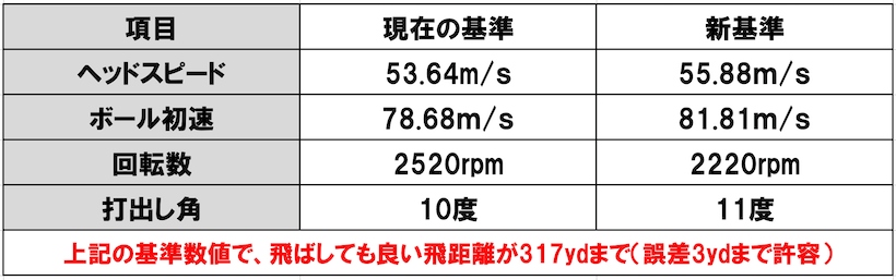 要は、ヘッドスピードが上がって、ボール初速が上がって、バックスピンが減って、打出しが高くなっても今と同じ飛距離しか出ちゃダメ!!という基準になるのだから、飛ばないようにするってことですね。