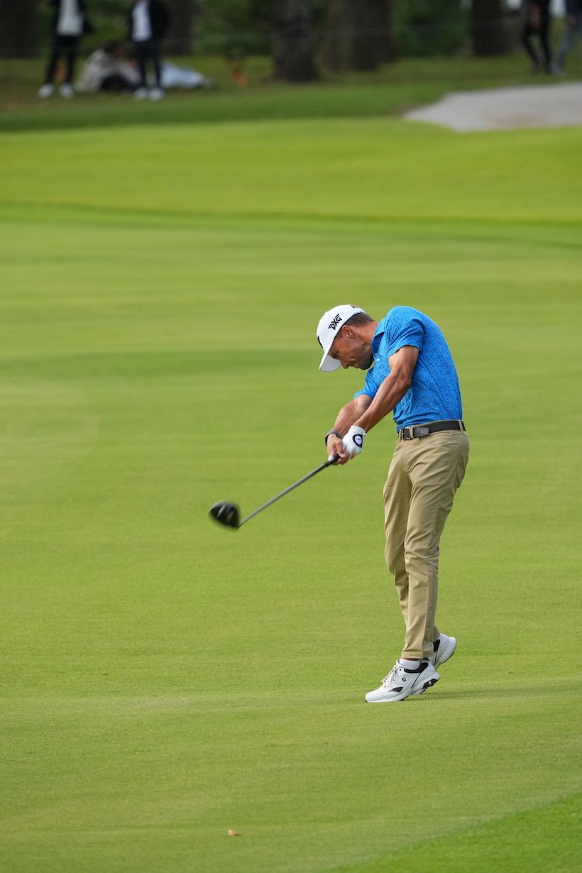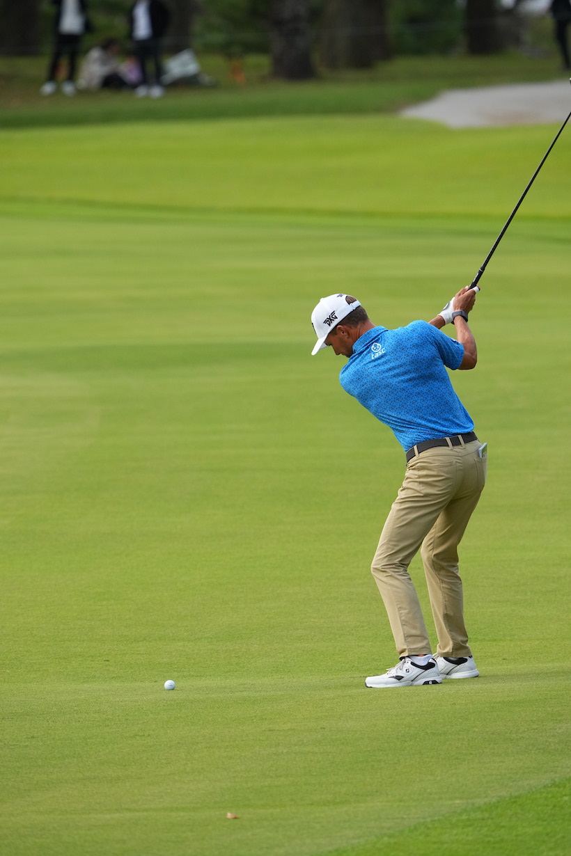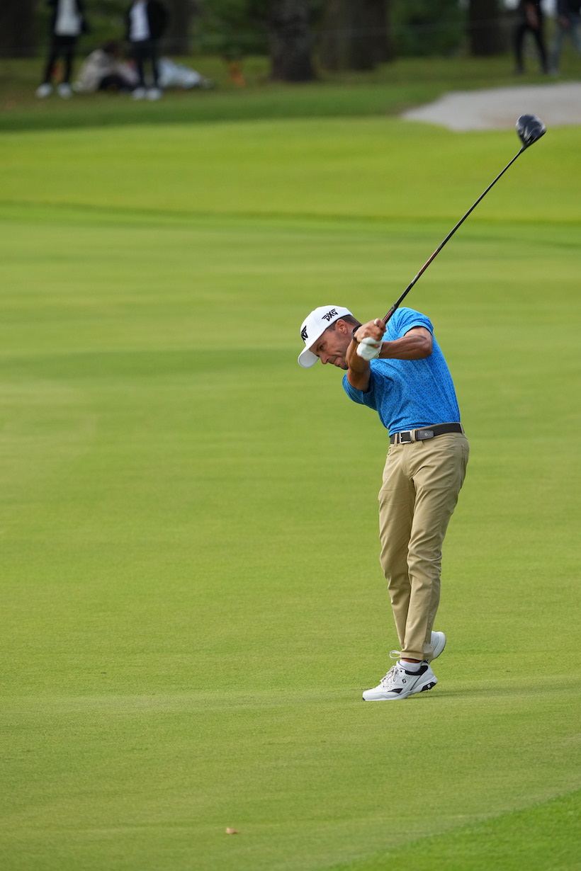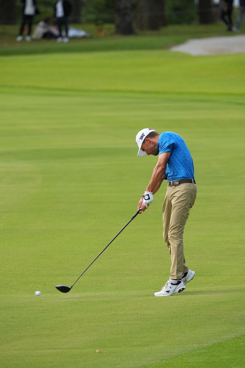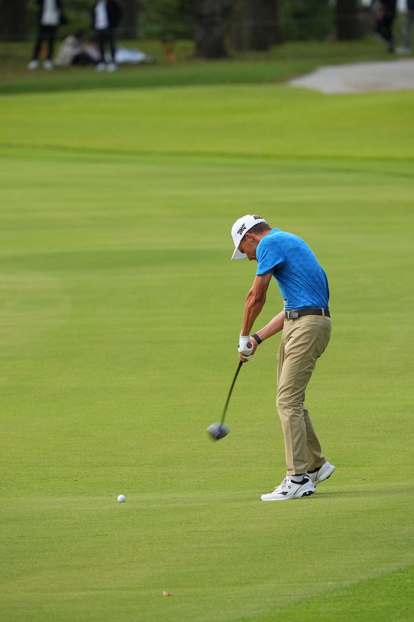 「まず、1人目はエリック・コール(35歳・アメリカ)です。彼は“史上もっとも美しいゴルファー”として知られ、日本のゴルフファンにも人気のあったローラ・ボーの息子さんです。23年のZOZOチャンピオンシップでは2位Tに入ったので、覚えている方も多いかもしれませんね。身長175cm、彼のスイングはオーソドックスなコンパクトスイングで、見るからに“飛ばそうとしてない”のがわかります。しっかり当てて置きに行く、アイアンショットに近いイメージです。ダウンスイングからフォロースイングまで体を先行させて、腕とクラブは後からついてくるだけ。エリックの感覚を代弁するとしたら『切り返しからは腕が勝手に下りてくるから、動かしてないよ』という感じだと思います。見事に体の回転が主体で、腕とクラブを意図的にリリースしていません」